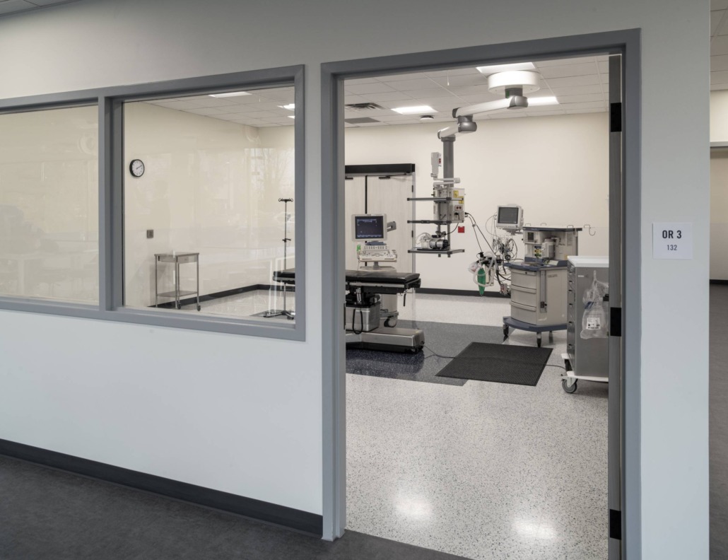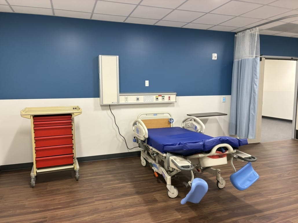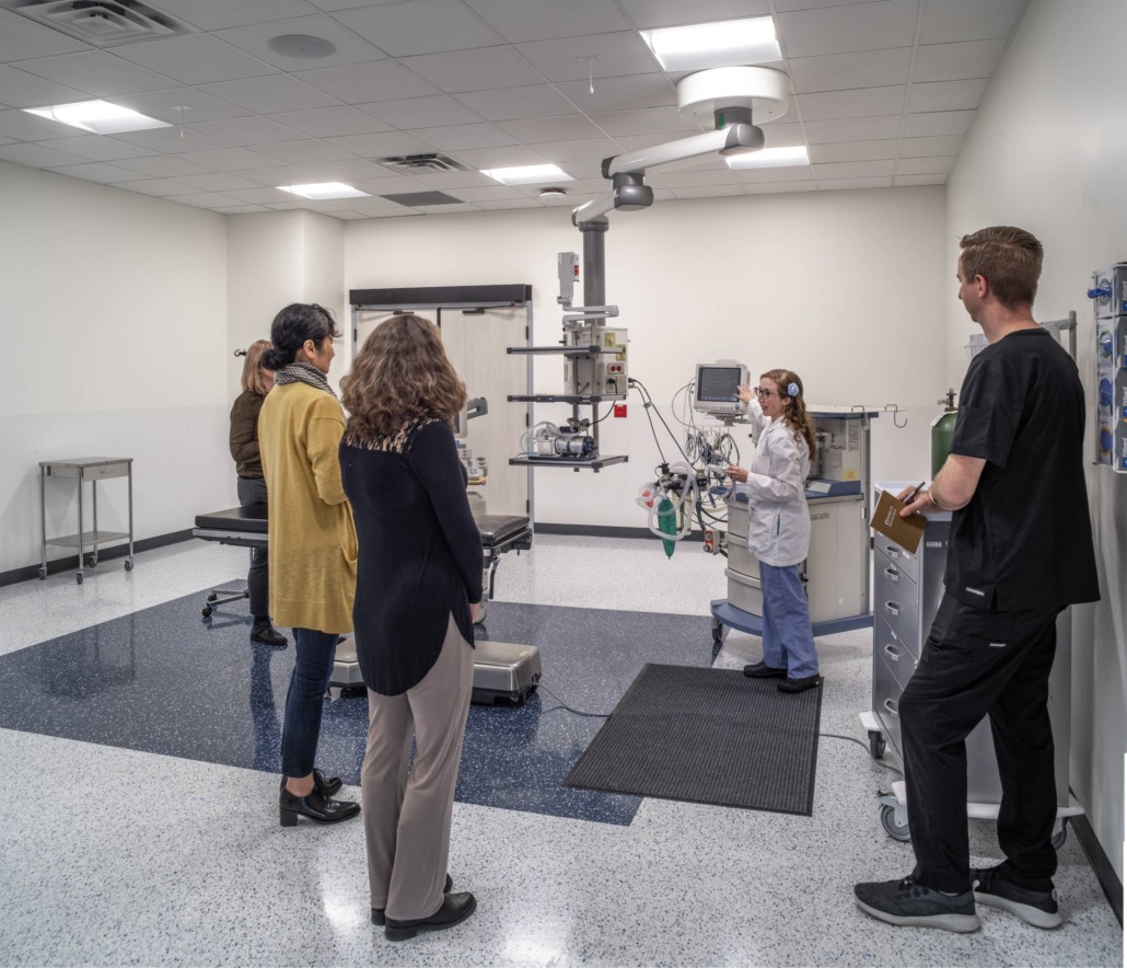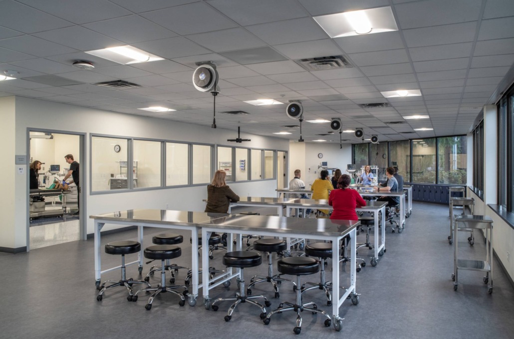 The building includes simulation labs dedicated to pre-op, operating, intensive care, maternity exams, birthing and clinic care.