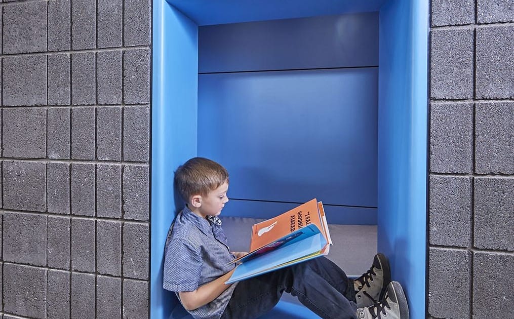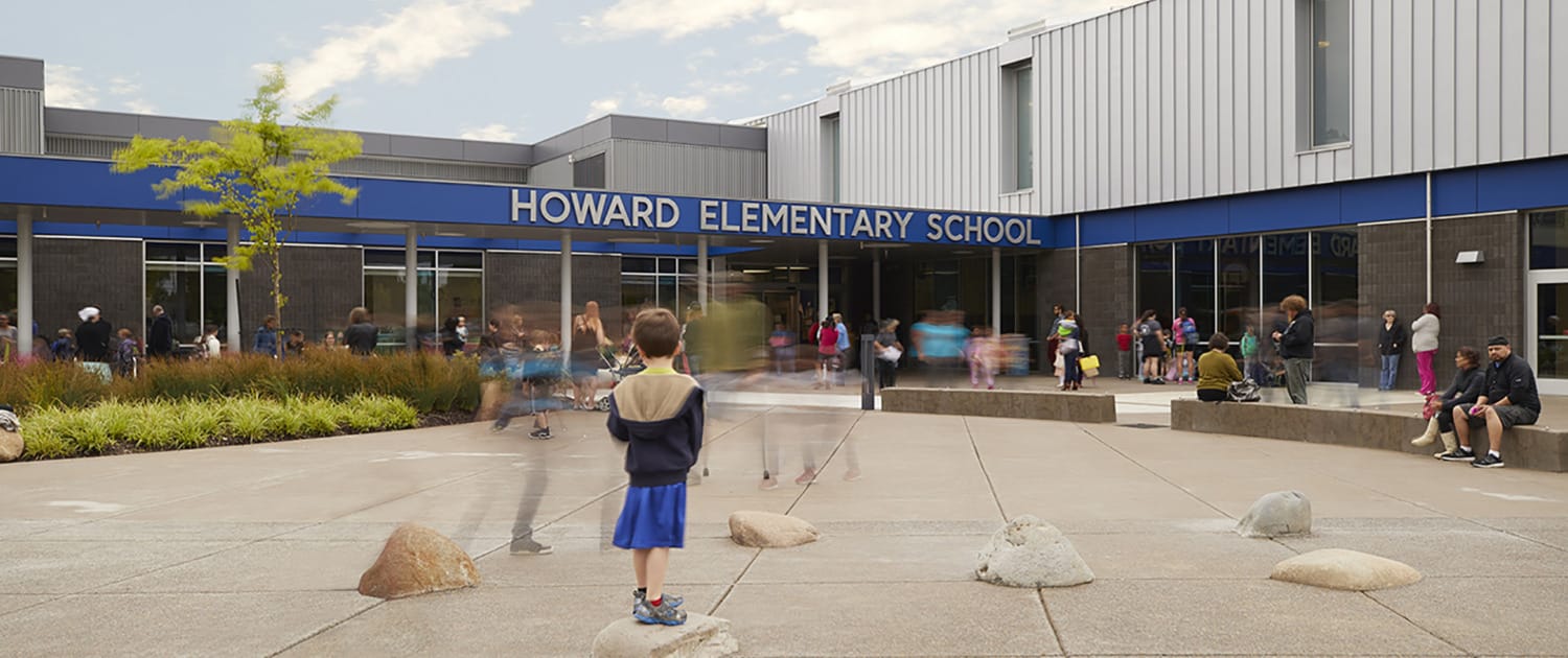 The new Howard Elementary School is a technology immersion school and features an array of state of the art systems for conservation, teaching and security.  Howard is an 88,000 sf 2-story building and was constructed directly behind the existing Howard Elementary School building.  The existing school was demolished and the area used for the new parking lot and baseball field.  The new building features an interesting combination of exterior finishes with sidings of metal, cedar, phenolic panel and CMU veneer.  The interior features polished concrete floors, glass classroom walls and reclaimed wood from the existing school demolition.