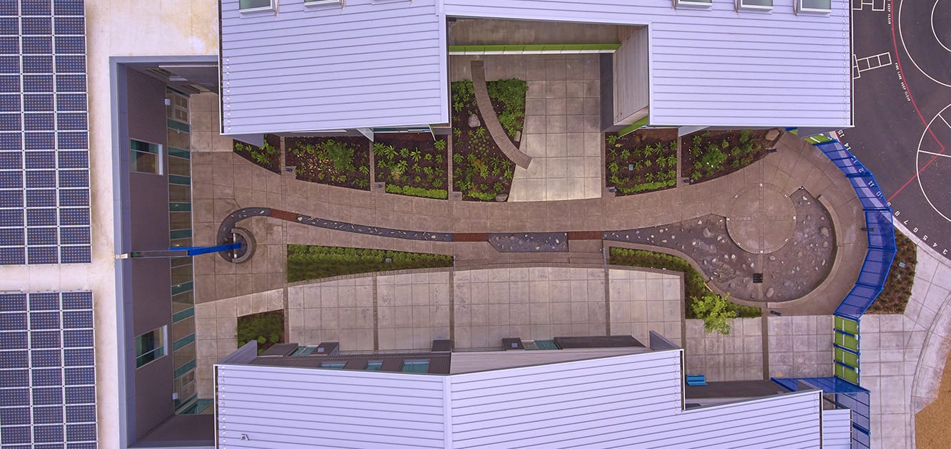 • Landscaping – The East and West courtyards feature “dry creek beds”.  Each creek bed receives water from the roof during a rain event but are also designed with reclaimed blue glass in the bottom to mimic water on a dry day.  Gardens are located on the South side of the building with composting areas.  The site storm water drainage system is designed with rain gardens to allow water to infiltrate into the soil before entering the City storm system.
